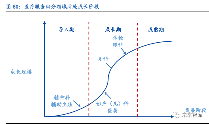 在细分赛道天然的不同连锁能力下,企业也表现出不同的竞争和盈利能力。综合来看, 体检、眼科和口腔已逐步进入成熟期,掌握可持续性获医能力的企业具有较强的获 客能力,进入品牌和业绩正循环阶段,正处在 1 到 N 的量变之路。而妇产、医美等 行业仍然处于变革期,相关企业具有一定规模,但行业内竞争激烈,同质化竞争充斥 导致销售费用居高不下,有待企业跑出 0 到 1 的质变之路。