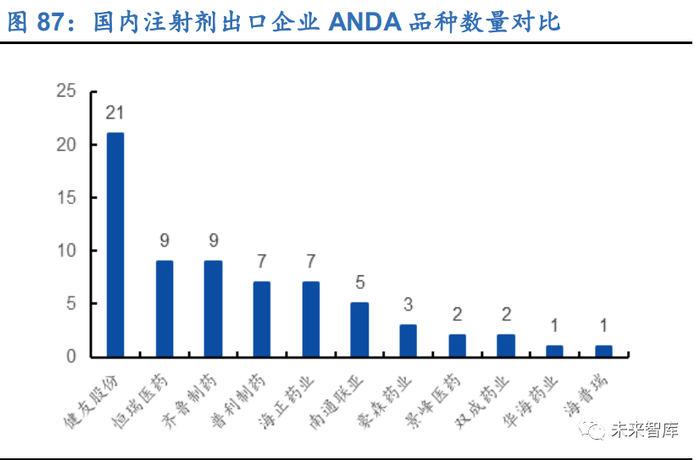 由于 FDA 对注射剂产品的研发和生产有着极为严苛的生产线 cGMP 检查标准,能够 顺利获批并稳定生产供应的注射剂仿制药品种很少,远少于口服固体制剂。2009- 2019 年间国内企业共获得 291 个 ANDA 批文(按申请号计),其中注射剂有 71 个, 且仅为恒瑞医药、健友股份、齐鲁制药、普利制药、海正药业、江苏豪森等 11 家企 业所持有,其中仅有恒瑞医药、健友股份、齐鲁制药、普利制药的注射剂产品具有持 续供应力。