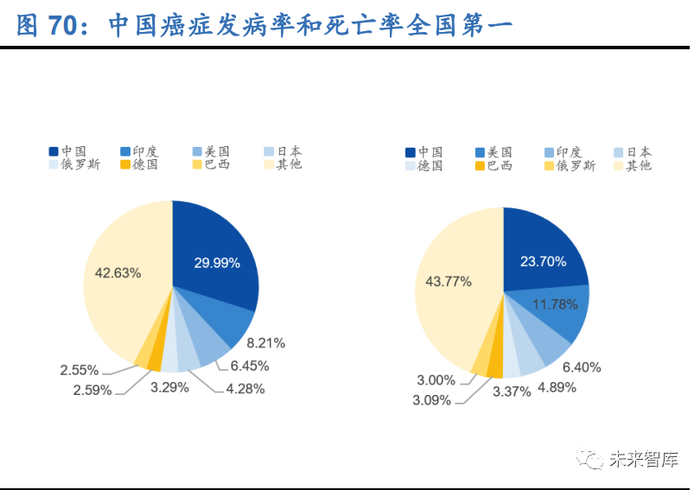 国内肿瘤患者基数大且逐年增长,大部分肿瘤确诊时为中晚期,肿瘤早筛潜在需求 大。中国是癌症大国,2015 年恶性肿瘤发病人数和死亡人数分别约为 392.9 万人和 233.8 万人,而且近十几年来仍有持续上升趋势。同时,每年恶性肿瘤所致的医疗花 费超过 2200 亿元,防控形势严峻。根据 IARC 公布的 2018 年全球癌症报告数据显 示,中国癌症发病率和死亡率全国第一。大部分肿瘤确诊时为中晚期,实现肿瘤早诊 和早干预是关键,能够显著提升患者五年生存率,以结直肠癌为例,中国人群结直肠 癌的 5 年生存率在 I、II、III、IV 其分别为 95%、73%、54%和 8%,因此,肿瘤早发 现和早诊断对于提升患者的生存率至关重要,同时也能减少国家和个人的医疗支出 负担。