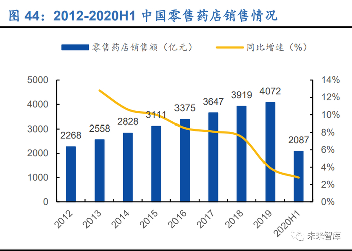 零售市场规模增速略有下降,线下药店呈现整合趋势。2019 年,药品零售市场销售 额为 4072 亿元,同比增长 3.9%,增速同比继续略有下降,2020 年由于疫情影响, 2020H1 增速下降至 2.8%。2019 年我国药店连锁化率提升至 55.34%,连锁型药店 数量规模显著提升,药店连锁化整合趋势凸显,然而 2019 年全国连锁药店企业达 6701家,其中多数为中小型连锁药店,top龙头连锁的门店仅占全国连锁药店的11%, 尚有较大提升空间。