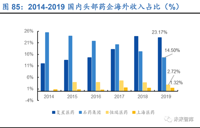 借鉴日本知名药企成功经验,国际化战略驱动公司快速成长。国际化战略对于制药 企业开拓国际市场、提升海外市场份额至关重要。上世纪 90 年代,日本药企在面临 政府控制本国药品价格和国内市场份额被跨国药企“侵蚀”的双重压力下,加快全球 布局的步伐,减小对本土市场的依赖,凭借成功的出口海外策略跻身国际知名药企队 伍,成为世界制药企业的后起之秀。以日本 5 家头部制药企业为例,2019 财年公司 海外收入占比较高,其中武田制药、安斯泰来、卫材和大冢制药 4 家药企一半以上的 收入来自海外市场,可以看出海外市场对日本药企业绩的增长有着重要的贡献。相比 之下,国内龙头企业海外业绩贡献较低,恒瑞医药、石药集团、上海医药、中国生物 制药等多数知名企业海外收入占比低于 20%,远低于较为成熟的日本药企,其中复 星医药自 2017 年完成对印度仿制药注射剂头部企业 Gland Pharma 及西非法语区第 三大药品分销公司 Tridem Pharma 的并购及整合后,海外业绩贡献逐渐上升,2019 年占比为 23.17%,但仍低于日本龙头药企。