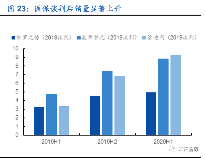 创新药实现“以价换量”。医保谈判的成功,在一定程度上使药品销售提速,尽 管在短时间内价格的断崖式下滑,可能对利润造成一定影响,但从长期性和竞争 性来看,医保是创新药必须做的选项。2019 年 11 月信达生物达伯舒(信迪利单 抗)成为唯一成功纳入医保的 PD-1 代表,销量实现快速提升,2020H1 在疫情 情况下仍然实现 9.21 亿放量;奥希替尼经 2018 年 10 月第三次医保谈判成功后 销售也快速上升,2019 上半年、2019 下半年和 2020 年上半年的销售额分别达 到了 4.7 亿元、7.4 亿元和 8.8 亿元。