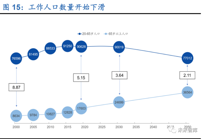 高医保覆盖率下,我国老龄化进程远快于发达国家,筹资能力逐渐乏力。根据联合国 统计,我国 60 岁及以上老年人在全人口中的构成比预计将增加一倍以上,将从 2010 年的 12.4%(1.68 亿)增长到 2040 年的 28%(4.02 亿)。相比之下,法国、瑞典 和美国 60 岁以上人口的比例从 7% 翻番至 14%分别用了 115 年、85 年和 69 年。在不远的将来,随着医疗技术的发展,60 岁的中国老年人有望比他们的父辈寿命更 长。2013 年中国 80 岁及以上老年人有 2260 万,到 2050 年,该数字或将提高 4 倍, 达到 9040 万人,中国将拥有全球最大的高龄老人群体。我国工作人口数量已经开始 下滑,根据统计局预测,2019 年我国 20-65 岁人口数量为 9.06 亿,同比下滑 2.84%。2019 年参加全国基本医疗保险人数达到 13.54 亿人,参保率稳定在 95%以上,其中 参加职工医保的有 3.29 亿人,参加城乡居民医保的有 10.24 亿人,享受待遇人次和 医疗费用持续增加,住院费用政策范围内、实际报销水平均有所提高,居民医保住院 费用实际报销比例全国平均59.7%,职工医保住院费用实际报销比例全国平均75.6%。随着老龄化进程加剧,在职退休比预计将在达到高峰后,呈现下降趋势。