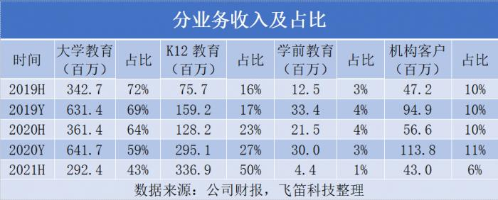 学前教育2021财年半年度的收入为440万元,同比下降了79.5%,占比也降至1%,主要是应用程序整合优化以及部分课程终止所致。