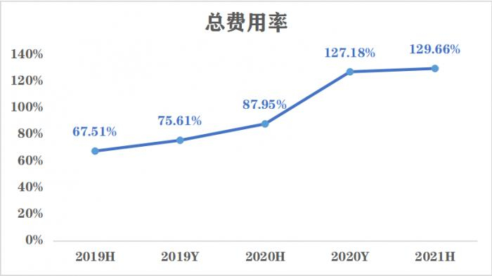 公司2021财年上半年的三项费用总计为8.78亿元,而营收才6.77亿元,仅费用就已经超过总营收。总费用率也继续攀升至129.66%,创出了2019财年以来新高。