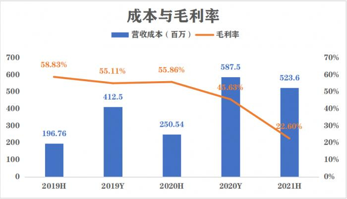 再来看公司的成本情况,2021财年上半年,公司的营收总成本较上年同期增长了109%至5.24亿元,最主要的是K-12教育分部投入大量资源来提高课程及服务质量,使得教学人员成本及课程研究人员成本增加所致。成本的增长使得公司的毛利率大幅下滑,2021财年上半年的毛利率仅为22.6%,上年同期的为45.63%,