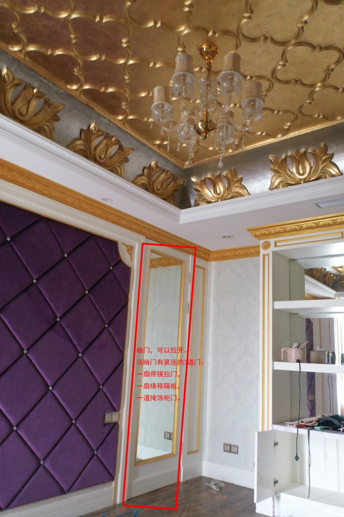 以手指夹住玻璃镜边框的凹凸装饰条,可以如开门一样拉开此门。拉开之后,能看到距边框10厘米左右的一整块白色木板,这使得这扇落地玻璃镜拉开后,给人以该镜背后其实是“死路一条”的错觉。