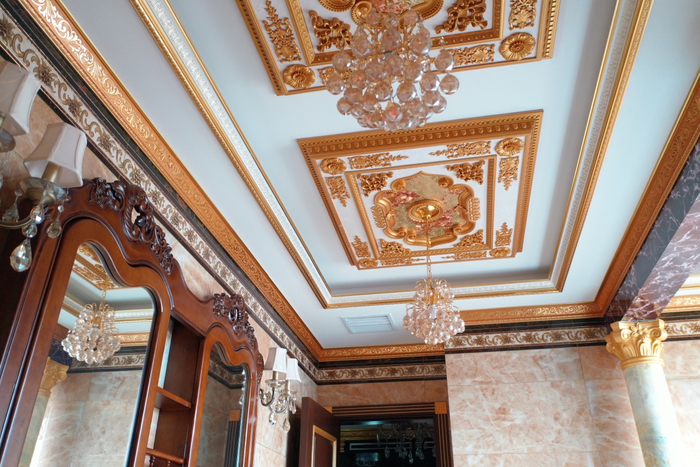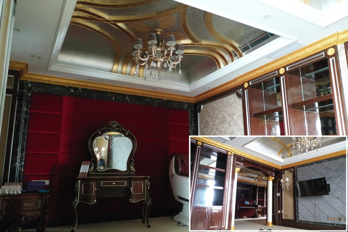 该房间的屋顶,在3米空高之外,再向上凹进40厘米,并分割成2个苍穹状空间,内敷金属质感的银灰涂料,布以浅金色的条状宽花纹,再设宽达20厘米的屋顶带浮雕鎏金压条。