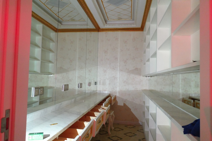 14美房间的西侧往南方向,是一个通道,该通道的东侧,是两个狭长的房间,分别长3米,宽1.5米。靠北侧的狭长房,北侧墙壁为巨幅镜子,南侧墙壁,为一排直通屋顶的小格搁物柜。镜子的下方,是梳妆台,有7个抽屉,可供7人同时梳妆打扮,为便于识别,暂称其为“7美化妆间”。
