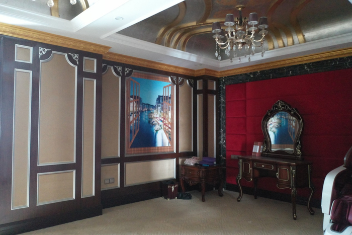 2号房间的靠床背板一侧的墙壁,是蓝紫色软包装饰,几乎铺满了整面墙壁,花纹为斜方格之间,衬以核桃大的玻璃水晶。此房间的天花板与其他房间的不同之处为,虽都有鎏金为吊顶边框,但其他房间的天花板,多为银灰色有金属质感的底色,而2号房间内的天花板,则是整铺鎏金色的浮雕花纹。