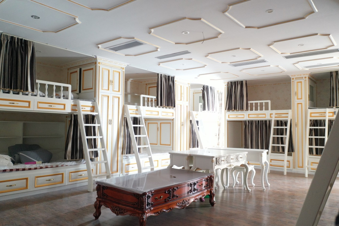 穿过2号房间的暗道,空间豁然开朗,这是一个可容纳14人住宿的集体闺房,装修风格依旧为白底嵌金,配以紫色软包、灰色床帘,有恬淡、雅致和轻奢的味道。14美的闺房如此雅致、有格调,也彰显了他们所服务的客人的尊贵程度。 《等深线》记者 程维 摄