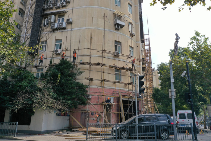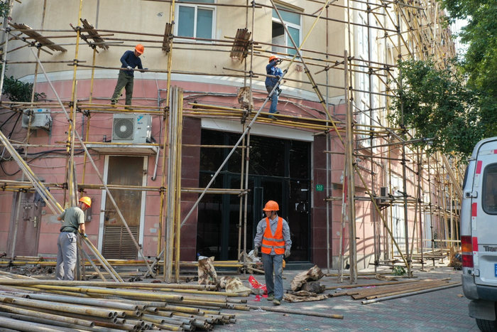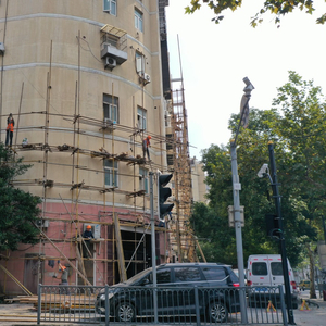2019年11月2日,“上海红楼”外开始搭建建筑用钢管架,工头谨慎答称,他们只负责搭架子,至于搭架子要干什么,不知道。当地相关部门几天前在楼前新建了一根黑色的监控柱,摄像头正对该楼的大门。门前灰色钢柱上的摄像头,原本是一直“盯着”惠民路西向的十字路口的,这几天开始“不务正业”,扭头死盯红楼的门口,或门口聚集的人群。 《等深线》记者 程维 摄