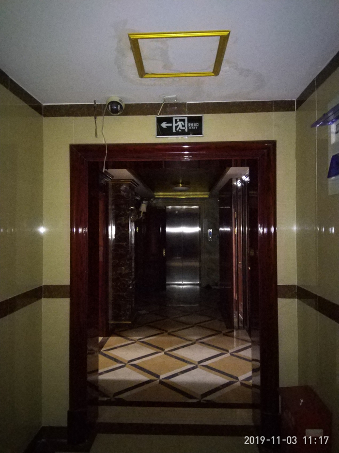 6楼的电梯出口,天花板的鎏金装饰,墙壁或立柱用带花纹的浅色大理石或黑色花岗石包裹,镶嵌花纹地板,与客房区域相比,已经简化到很含蓄的地步了。此通道的最大看点,是该通道进入客房区域后的双开门上方,有一个摄像头——任一从此门出去的客人,都能拍到正脸。 《等深线》记者 程维 摄