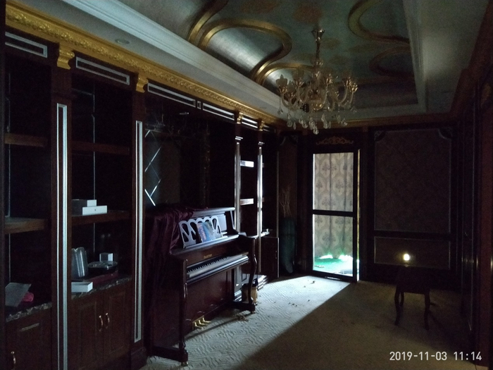 向西进入“1号套房”,首先映入眼帘的是正面7米外的一扇门外,窗帘缝透进来的光线。上午时分,这束光线打在左侧(南侧,许昌路一侧)的暗红色壁柜及立式钢琴上,颇有一些恐怖片的画面氛围。