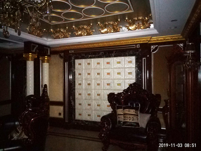 “暗黑客厅”的左侧(西北侧)墙壁及凌乱摆放的木雕真皮沙发。此客厅无自然光线进入,且客厅的正面为一块巨幅黑色带纹路的花岗石,更显得该公用客厅有一丝庄重、沉稳的氛围。但这一氛围,在金碧辉煌的屋顶、吊灯、墙壁、家具等富贵之气辉映下,体现出一种特殊的奢华。 《等深线》记者 程维 摄