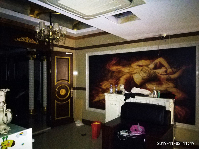 因该会客厅内电源已切断,且东、西、北3个方向均无窗户及光线透入,南侧光线也无法直射,因此其奢华及流光溢彩,无法在拍摄画面及现场体验中得到体现。