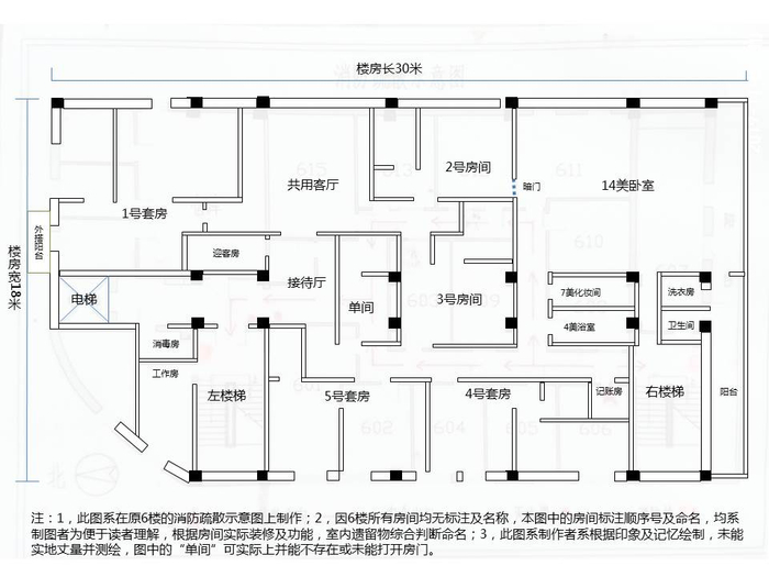 为便于向读者展示,记者在本文中根据实地查看情况,以及装修、设备设施、功能配置,特别是遗留物性质等,对该楼内的各个房间(或套间)予以编号,并命名,以便快速理解该楼层概貌。