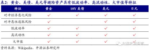 黄金及美债、美元等能成为优质避险资产,缘于能够对冲风险偏好回落,并具备低波动率、高流动性、大市值等特征。定义来看,避险资产指的是市场变化过程中,价格波动相对稳定的一类资产。与风险资产相比,避险资产的“避险属性”主要体现在能够对冲风险偏好回落。与此同时,避险资产中,波动率越低、流动性越高、市值越大的资产,越“优质”。黄金、美债、美元及日元等,均是优质避险资产。黄金因为可以同时对冲经济衰退和恶性通胀风险,并且天然稀缺、具备价值储藏功能等,也被称为避险资产之王。