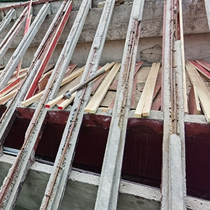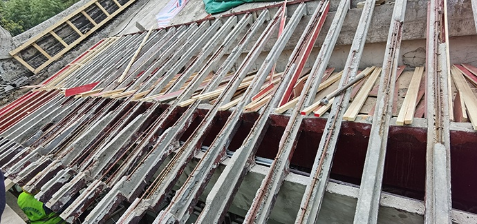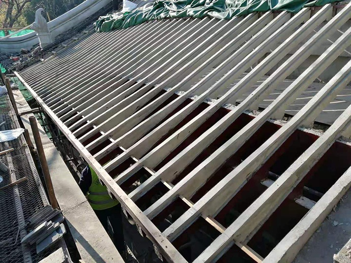 首先清理混凝土椽子酥松部分。由于保护层已完全失去作用,必须彻底清理干净后重新浇筑。接着是裸露钢筋除锈,这些钢筋是关键的受拉构件,绑扎牢固后涂防锈漆,需仔细检验钢筋是否修复到位。随后,还要根据原钢筋混凝土椽子的截面尺寸在两侧支模,采用强度较低的灌浆料进行浇筑,灌浆料凝固时间快,但要注意强度不能过高,会导致原钢筋混凝土构件破裂。