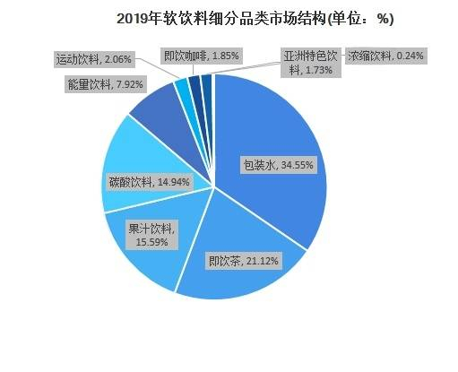 根据欧睿数据,软饮料行业细分品类表现分化,呈现“一超多强”的竞争格局。在软饮料的市场里,碳酸饮料也逐年不被“待见”。据前瞻产业研究院分析,我国软饮料市场规模虽然在不断扩大,但随着市场趋于饱和,市场规模增速也开始逐渐趋缓。2019年我国软饮料市场规模为5786亿元。其中,包装饮用水是最大细分品类,市场规模高达1999亿元,占比34.55%。而碳酸饮料市场规模仅有864亿元,占比14.94%。