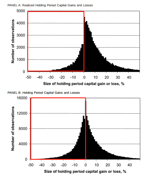 如图所示,A是已经卖出结算的收益分布(平仓盈亏),B是还在持有中的收益分布(浮动盈亏)。分布图的左侧显示大额亏损部分,A显然要小于B,这意味着,个体投资者更倾向于持有已经大额亏损的股票而不是止损(或者说割肉)。