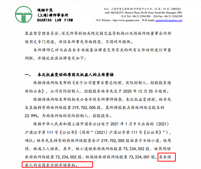 甚至北京观韬中茂(上海)律师事务所还发布了一份“法律意见书”,确认:林奇先生持有的游族网络股票由其子女3人继承,其余继承人均自愿表示放弃继承权。