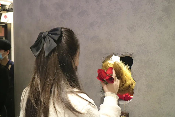 灰色的墙上开出几个洞,毛茸茸的熊爪缓缓伸出,为顾客递上咖啡,每杯咖啡上都贴着玫瑰花瓣,熊爪还会与顾客互动,显得活泼俏皮。