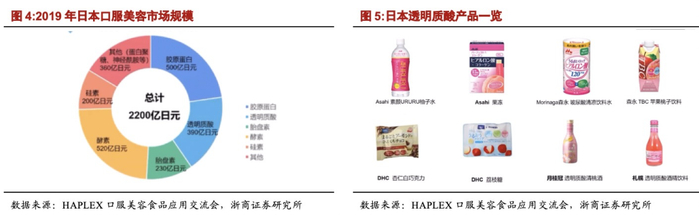 参考日本,国内透明质酸食品市场规模扩张空间充分。透明质酸作为食品添加成分由来已久,其口服后可以起到增加皮肤水分、抗氧化、抗衰、保护骨关节健康、运动营养、呵护眼健康及胃肠道健康等作用,尤以美容相关功效受到消费者欢迎。作为最早开发和流行透明质酸口服美容产品的国家,日本2019年口服透明质酸原料产品市场规模为390亿日元(合24.4亿人民币),占到日本口服美容产品原料市场规模的18%,朝日、森永、明治、可口可乐、POLA、FANCL、DHC等都开发了透明质酸相关食品,形式包括饮料、果冻、软糖、口服液等等,考虑口服美容市场的主力消费者为女性,日本15-64岁女性数量大约为4000万人,我国同年龄层女性人数达到4.8亿人,随着终端产品的丰富以及消费者认知的提升,我们认为长期来看国内透明质酸食品原料也拥有百亿级别的消费市场。