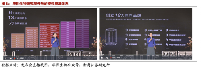 构建智慧科技共享平台及授权体系,赋能产业链上下游。在1/22发布会中,董事长赵燕女士宣布华熙生物研究院平台上线,该平台开放资源包含:1)研发平台,吸引更多研发机构及科研院所探索科学本质;2)开放企业的30条中试生产线,吸引合作伙伴将基础研究成果实现产业落地;3)开放应用平台:吸引更多其他行业合作伙伴实现跨界发展,开发生物活性在新领域与和日常生活应用。