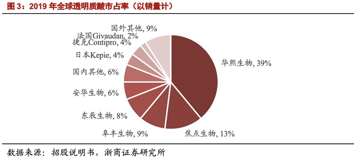 1)国际领先的微生物发酵法生产透明质酸技术,产品产率高、杂质水平低、成本优势明显。截至2019年公司透明质酸发酵产率可以达到12-14g/L,而行业平均产率仅达到6-7g/L,有效促进了生产成本的降低;高产率同时,公司通过发酵、纯化、精制等工艺优化,产品质量超过欧洲药典标准和日本药典标准,核酸、内毒素等杂质水平分别为0.01(A260nm)和0.0025EU/mg,仅为欧洲国际药典标准规定值的1/50和1/20,产品具有高安全性、高纯度、高稳定度。