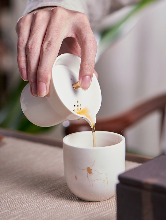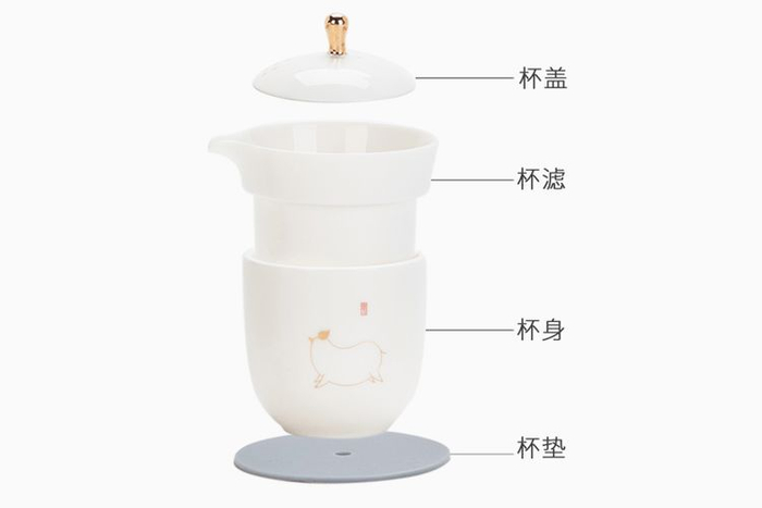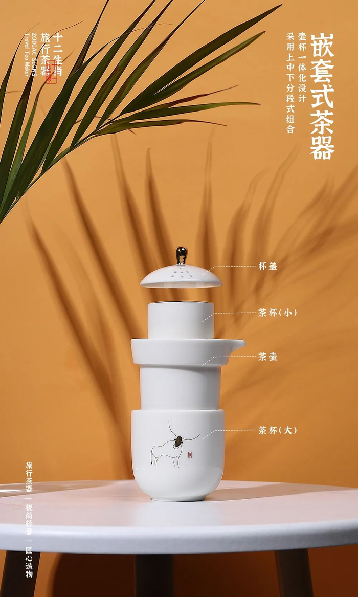 一人独饮时,无需囿于一整套的茶具,只需拿出一副生肖杯,将它沿分割线上下分开,便一分为二,上杯可做茶壶,底杯可送饮入口。