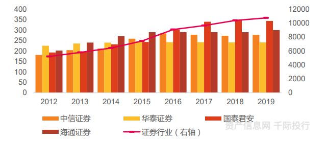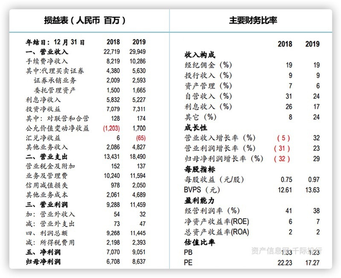 从具体的各项业务来看,2019年代理买卖证券业务净收入(含席位租赁)实现787.63亿元、证券承销与保荐业务净收入377.44亿元、财务顾问业务净收入105.21亿元、投资咨询业务净收入37.84亿元、资产管理业务净收入275.16亿元、证券投资收益(含公允价值变动)1,221.60亿元。截至2020年末期末A股投资者数为17777.49万。