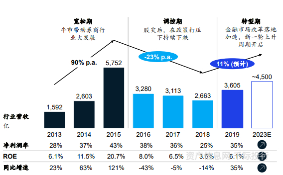 券商板块具有高度周期性特征,这种周期性有别于受经济周期影响而著称的周期股,券商股的周期性来自监管与市场影响,作为高度受监管行业,监管的放松与收紧影响着券商业务的扩张和收缩,而券商又是做资本市场的生意,市场的冷热交替牛熊转换 亦会显著影响券商业绩。当监管政策放松叠加市场行情向上二者共振时,券商板块往往产生明显超额收益,券商板块历史上的两轮大行情无不例外。