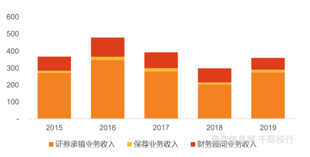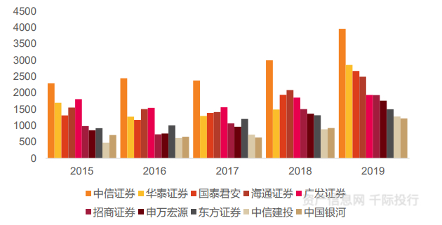 图2015-2019 年头部券商投行业务收入对比(单位:亿元)
