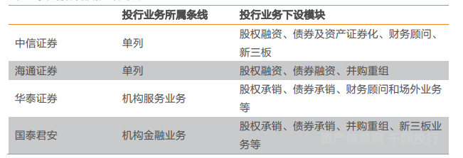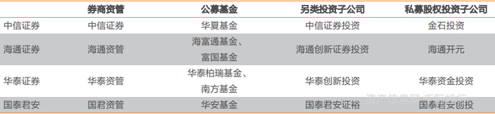 资管业务:证券公司的投资管理业务主要包括券商资产管理业务、公募基金管理业务、私募股权投资 基金、另类投资等。中信证券、海通证券、华泰证券、国泰君安的业务布局如下。