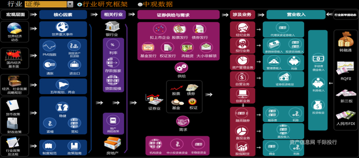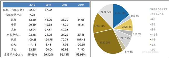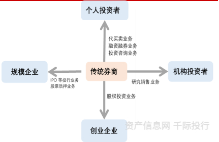 投行业务:证券公司的投资银行业务主要包括股权融资业务、债券融资及资产证券化业务、财务顾问业务、新三板业务等。投资银行业务是证券公司承担金融中介职能的直接方式,作为企业直接融资的主要渠道,发挥着优化社会资源配置的作用,属于证券公司的传统业务和主要利润来源之一。投行业务链条延伸:从保荐到创投、再融资、财富管理。