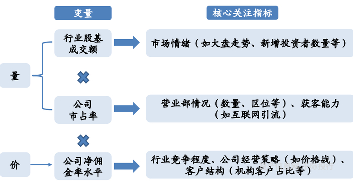 轻重资产业务驱动因素完全不同。轻资产业务主要驱动因素为业务规模,由于不需要过多资本投入,因此业务弹性很大。同时,该业务存在一定的同质性,管理费率由于竞争加剧呈现不断下降趋势。重资产业务更多地体现证券公司的主动管理能力和现有资源能力,往往能力强的券商业务规模也相对较大,实现规模和费率双优势。为了清楚展现券商的业务构成以及相应的驱动因素,我们采用“价” “量”分析的方法进行汇总。