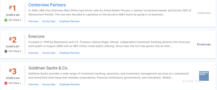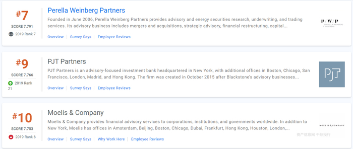 Vault 发布的 2020 年银行 50排名。他的排名来自Vault的年度银行调查。这项调查于2019年秋季进行,要求3,300名各级银行专业人员根据声望评估其同行公司,规模为1至10(他们无法对自己的公司进行评价,并要求只对所熟悉的公司进行评价)。他们还被要求对自己的公司进行各种生活质量类别的评级,包括薪酬、工时、公司文化、商业前景、培训、工作/生活平衡和总体工作满意度。将一个加权公式(包括外部声望分数和内部生活质量分数)应用于此数据,以创建银行TOP50。一些非传统知名投资银行位列前茅。