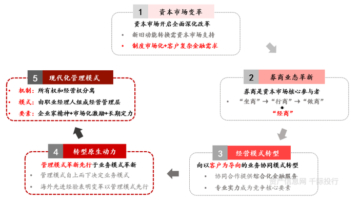 1/ 差异化发展。目前证券公司面临同质 化竞争问题,同时监管引导证券公司差异化发展,对于国内大部分证券公司来说,主动探索差异化的发展路径已成为趋势。