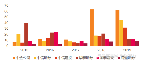 图2015-2019 年头部券商 IPO 项目规模对比(单位:亿元)