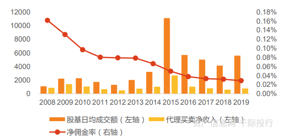 图经纪业务的净佣金率的降势趋缓,但交易量已趋势向上(单位:亿元)
