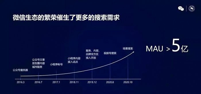 据微信官方介绍,目前微信搜一搜月活用户已超过5亿,拥有包括首页搜索框和发现页搜一搜两个一级入口,及聊天页面、朋友圈页面内的多个次级入口。在今年的公开课上,微信搜一搜更是被放到了与小程序、微信支付和视频号并列的地位。