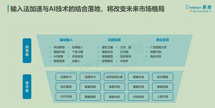 易观《中国第三方输入法市场专题分析2019》调查报告显示,除了AR表情外,输入法在应用层和技术层的文字图片扫描、实时转译、语音识别、图像搜索等多个重要功能目前在微信内都已实现。