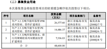 按照伟星新材的招股说明募集资金用途,主要为管材、管件的项目的建设,最大的产能投入为PPR管项目建设,占比将近60%。