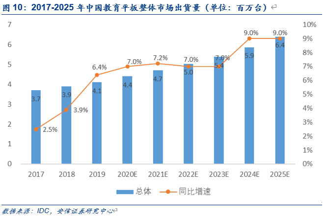 疫情刺激在线教育需求增长。据IDC预测,中国教育平板出货量呈持续增长态势。2019年中国教育平板整体出货量达400万台,预计2021-2022年出货量增速为7%。随着后期疫情逐渐得到控制,但随着疫情期间持续推广的在线教育与学习模式,加之国家政策的推动和 “互联网+教育”、“智能+教育”技术的发展,预计2024 -2025年增速将达9%,2025年教育平板出货量将达到600万台。