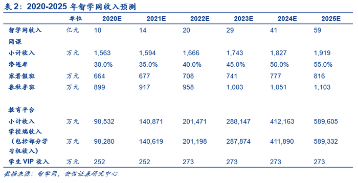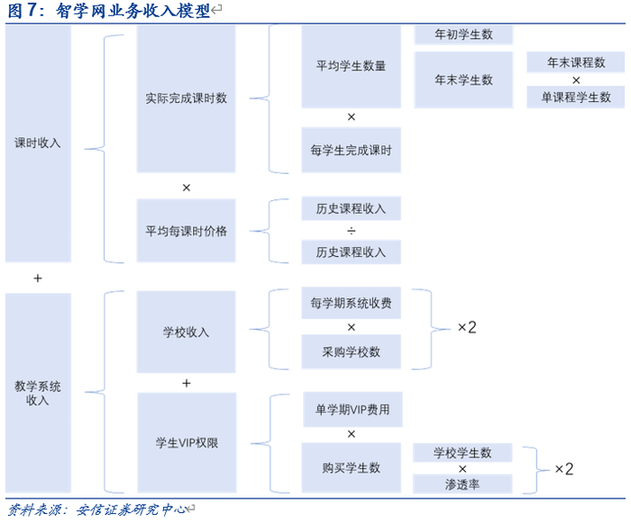 就网课层面,目前智学网网课覆盖一年级-高三年级。针对不同年级段的学生,智学网网课单次辅导价格在499元-899元不等,主要分为寒暑假提分班与春秋季班课,单系列课程学生上限为1000人。就教育平台层面,智学网主要与学校签订协议,由学校进行采购并为每位学生配备智学网账号,学生个人可选择购买VIP权限,查看自己年级排名,获取多维学情分析等数据,VIP权限为700元/学期。