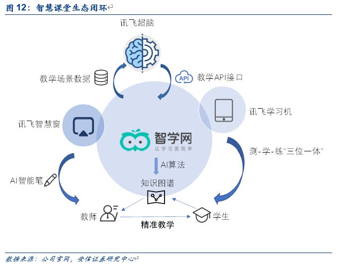 讯飞超脑,强大算力构筑学生学情画像。类似于数据中台,讯飞超脑堪比智慧课堂的“最强大脑”。讯飞超脑本身为智慧课堂各类互动如学生测评反馈,学生错题记录分析等提供算力支撑,同时内嵌的AI算法在收集教学场景数据的同时可持续进行“自我迭代”,更好、更真实得为教师绘制“学生学情画像”,辅助教师因材施教。