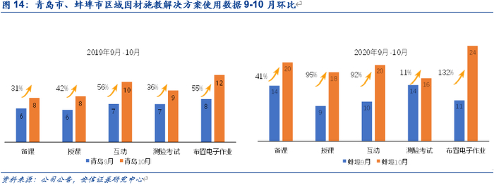 区域因材施教解决方案交付进度良好,已进入常态化使用。目前,科大讯飞因材施教区域解决方案青岛、蚌埠项目已基本完成年内交付计划,产品已进入常态化使用。其中青岛市已覆盖西海岸区149所学校、1.29万名老师、18.4万名学生。2020年10月使用相关产品备课15.4万次;授课7.98万次,互动5.2万次,测验考试45次,布置电子作业290.7万份。蚌埠市已覆盖816所学校、2.3万名老师、41.3万名学生。2020年10月使用相关产品备课20.2万次,授课8.86万次,互动9.8万次,测验考试268次,布置电子作业162.9万份。就升学率而言,农村乡镇学校整体一本率提升3%左右。