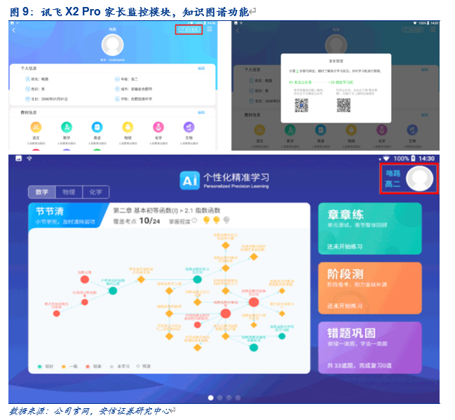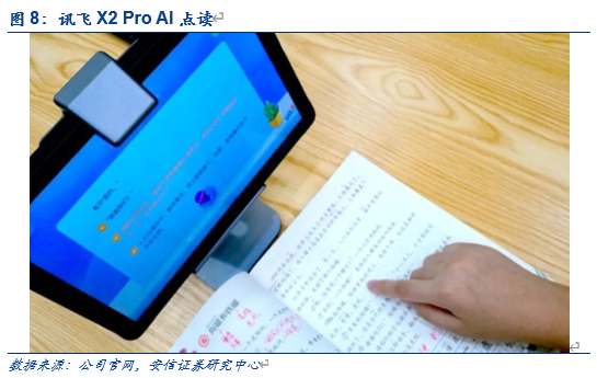 针对课后老师无法及时答疑的问题,公司推出讯飞学习机。目前讯飞学习机已迭代至X 2 Pro系列。不同于市面上其他教育产品,讯飞X pro在系统上做了充足的场景化定制功能,内置的讯飞AI双引擎,“7重安全防护”可令家长对各类第三方APP进行授权,可以对孩子的访问记录,软件使用频次进行远程监控;通过手机、微信绑定讯飞学习机,家长端可以实时接收孩子的知识图谱,即使掌握学习情况。