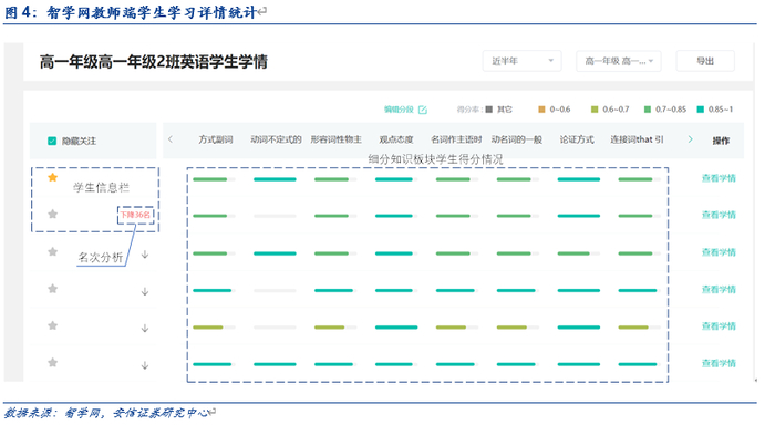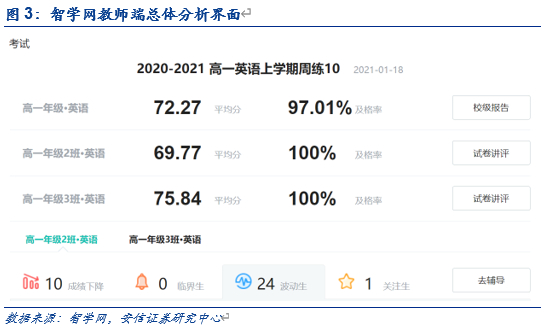 教师端:智学网主要为教师提供自动数据分析服务,通过教师对学生作业的每次批改与学生成绩的归档进行统计,并细分到每个学生的每次作业。从而生成学生的“成绩画像”,协助教师分析每位学生的薄弱点,把控班级整体的学习情况。